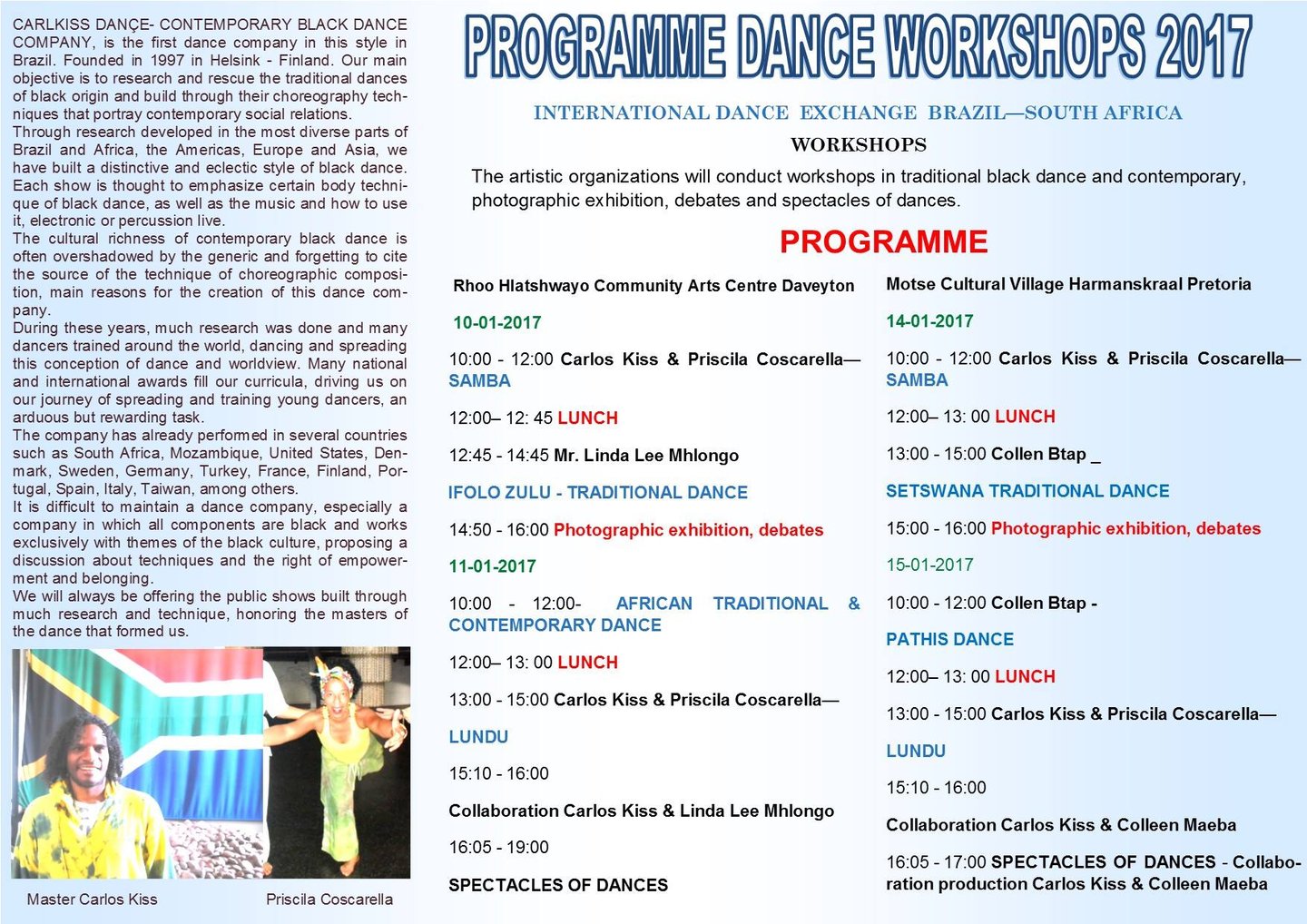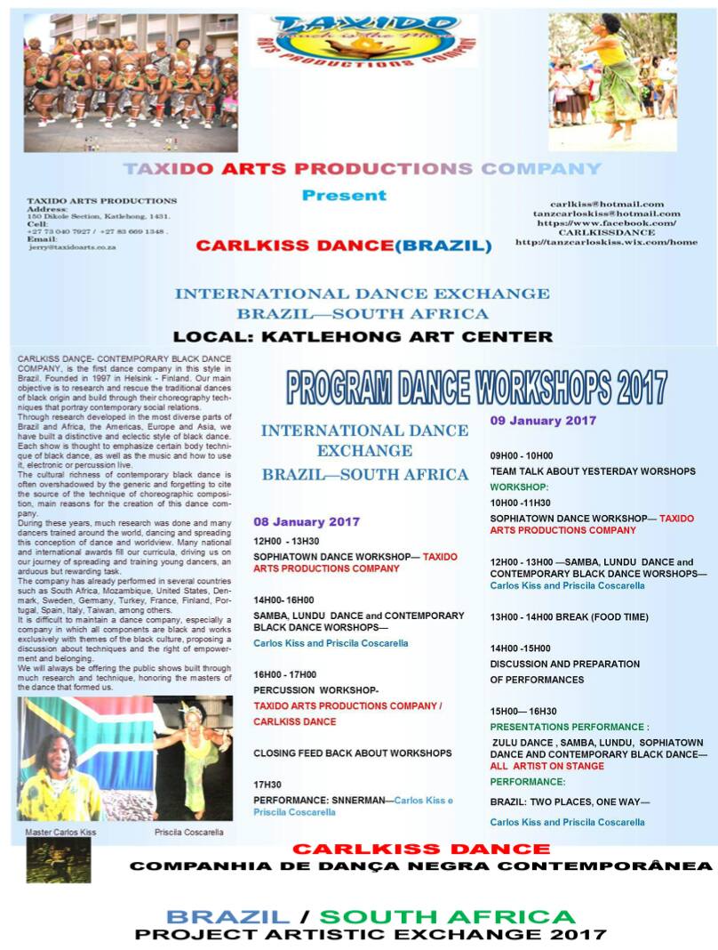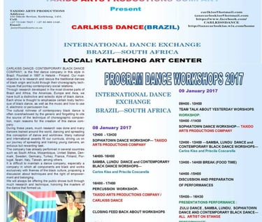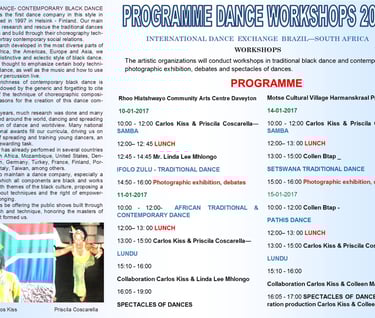 O Intercâmbio Internacional de Dança Negra 2017, realizado pela Carlkiss Dance – Companhia de Dança Negra Contemporânea e pelo Ponto de Cultura Espaço Arte Africana, teve como palco a África do Sul, país símbolo de resistência, ancestralidade e reconstrução social. Esta edição se estendeu por 15 dias de intensas vivências artísticas, passando por quatro importantes territórios: Soweto, Orange Farm, Daveyton e Katlehong, localidades que guardam uma profunda história de luta e afirmação do povo negro sul-africano.